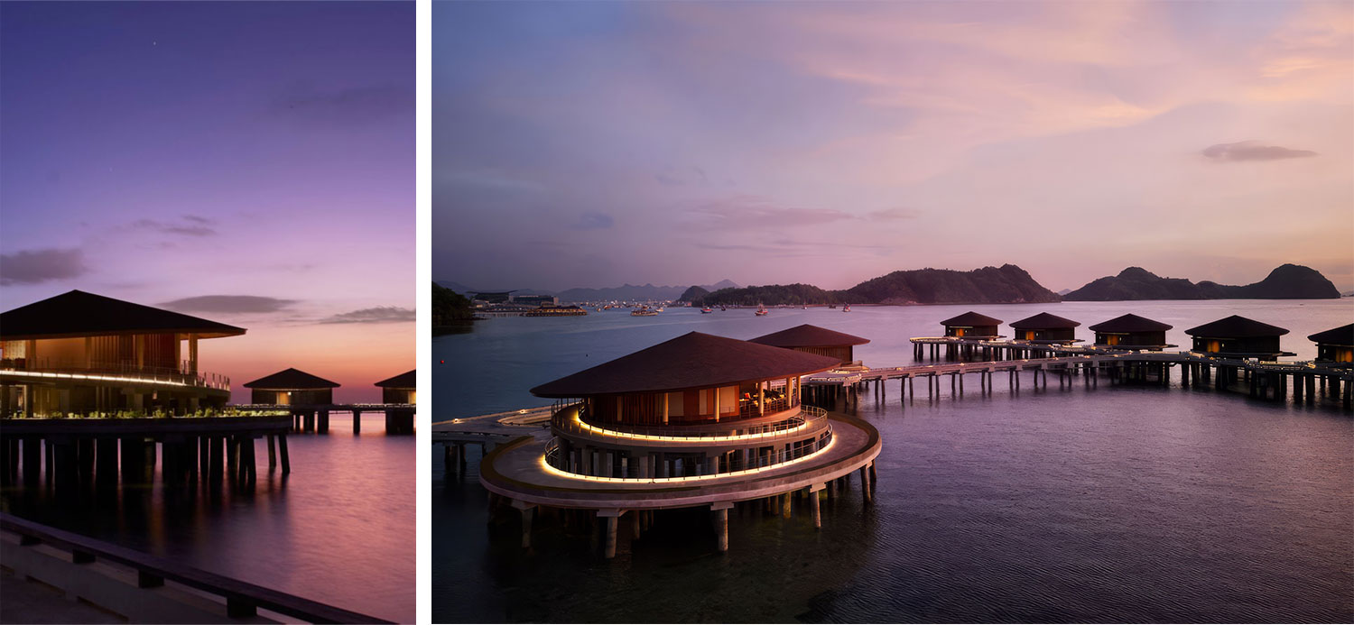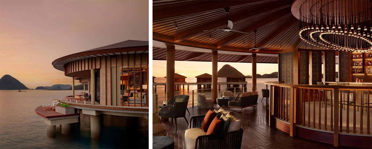 The experience unfolds as a gradual transition. From the main structure anchored on land, the architecture reaches outward into overwater villas, creating a subtle shift between stability and lightness. Set above the water, the villas open toward panoramic views of the turquoise sea, reinforcing a continuous relationship with the horizon.