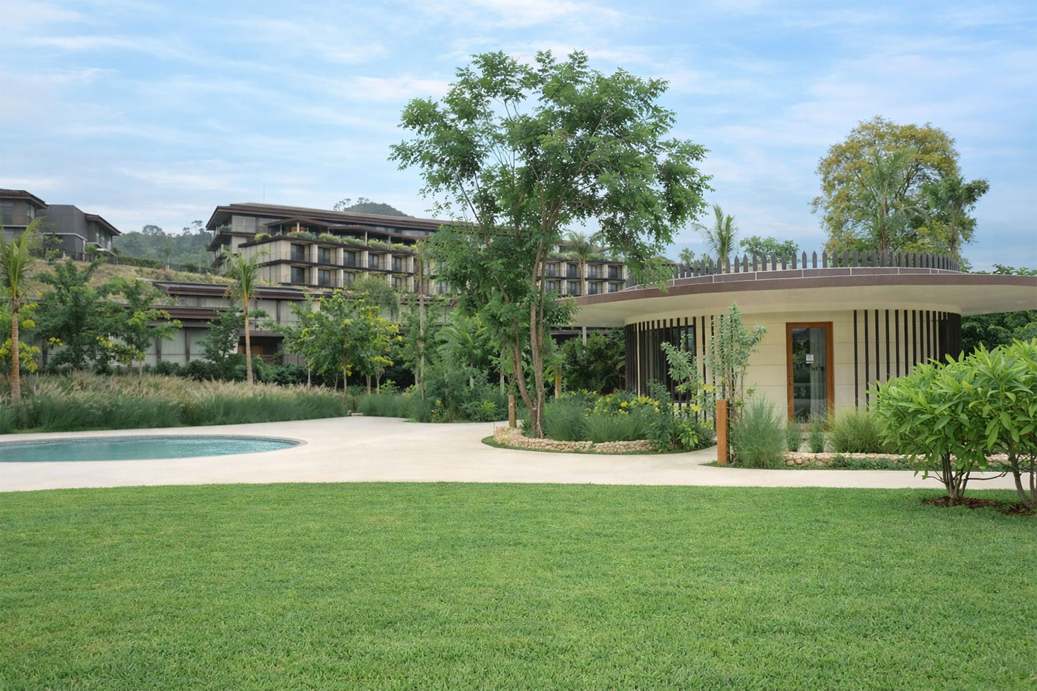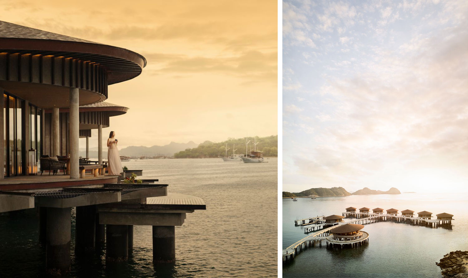 Horizontal lines and circular forms define the language, allowing the architecture to flow with the landscape of Labuan Bajo. The composition remains closely connected to its surroundings, extending from the terrain toward the water.