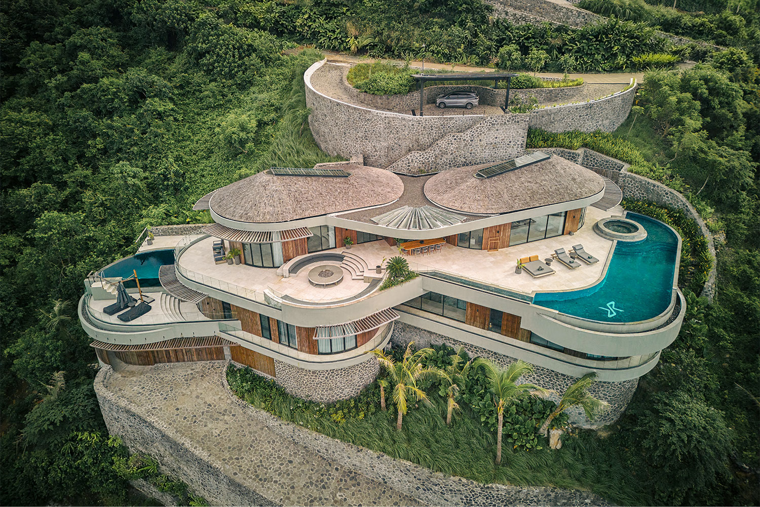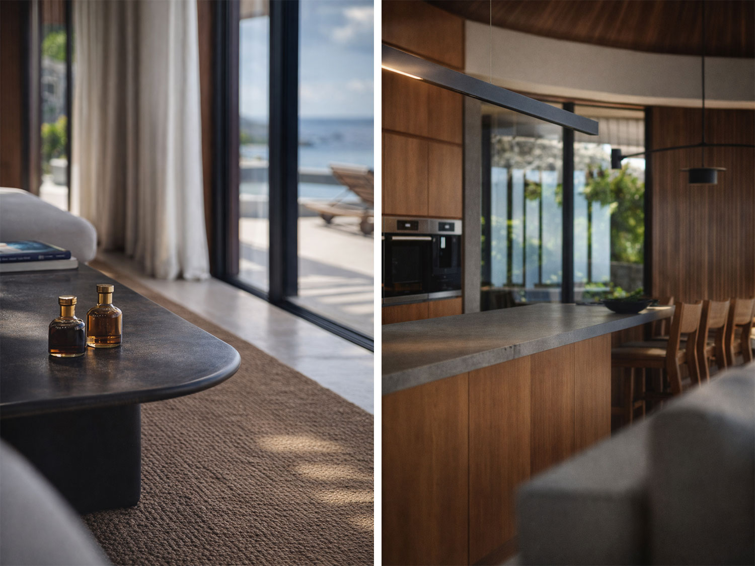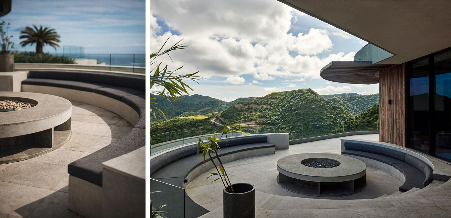 Circular forms shape the communal heart, where outdoor lounges, dining areas, and fireplaces are arranged as moments of pause within a continuous flow. These spaces are not isolated rooms, but extensions of the landscape itself, framing views of the coastline while inviting people to come together in an atmosphere that is both intimate and expansive.