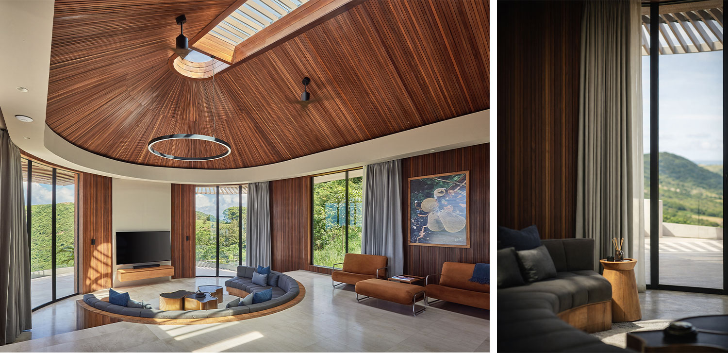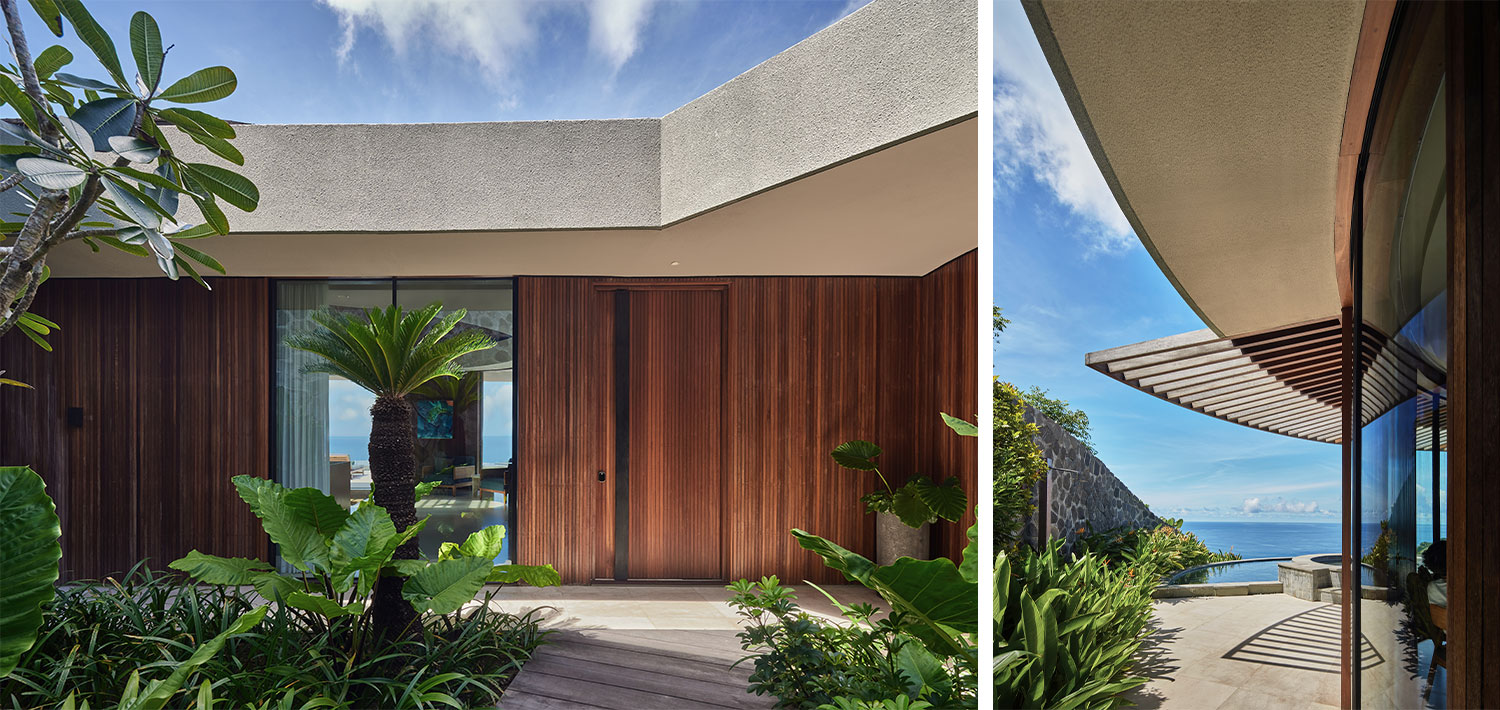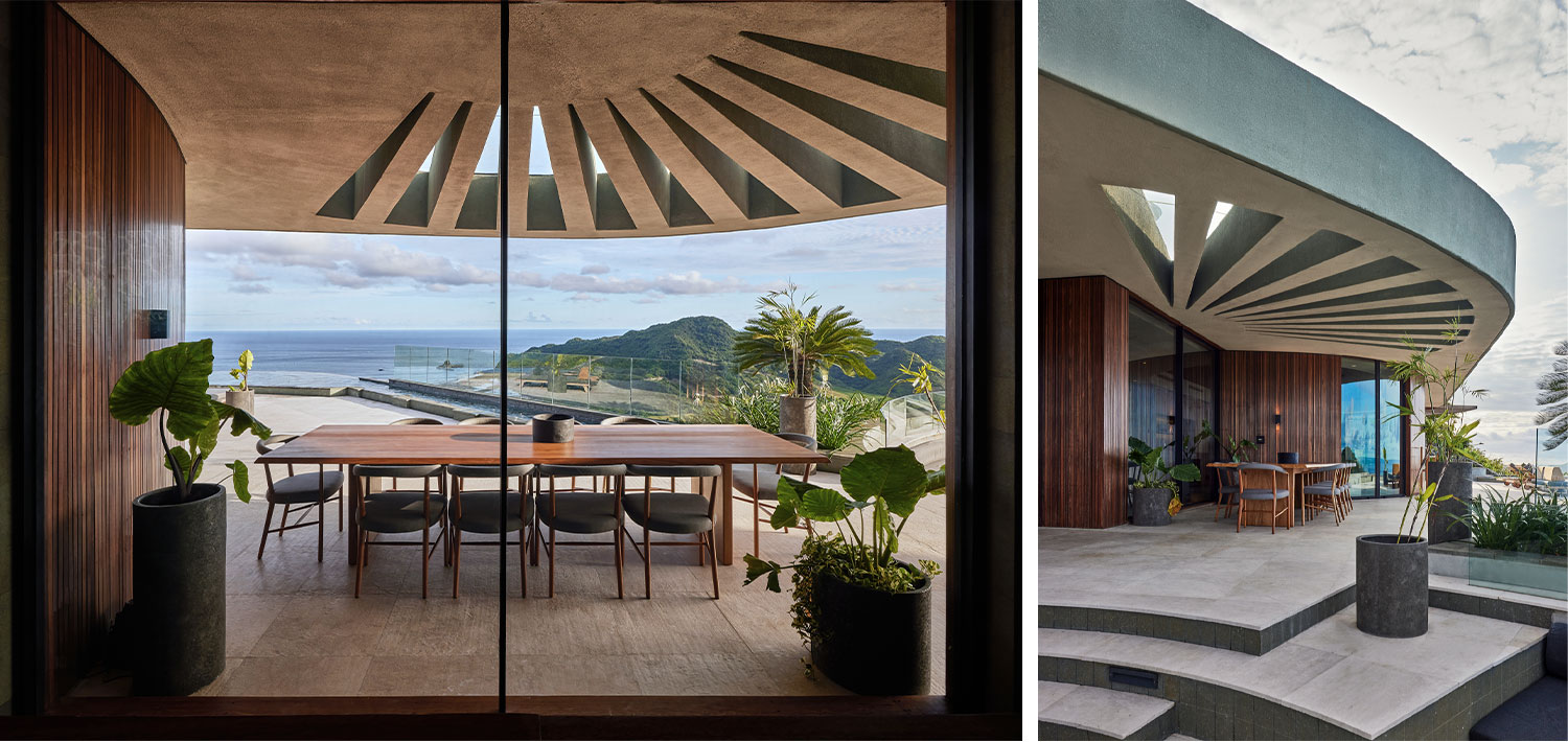 Movement through the house becomes a gradual sequence of unfolding perspectives. Curved terraces and overhangs guide the body, offering shelter while maintaining openness to the horizon. The architecture feels grounded yet light, anchored in stone while softened by warm timber and crafted ceilings that echo traditional techniques.